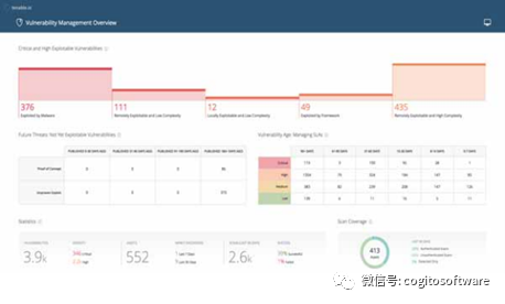 Tenable.io用户界面提供预配置、开箱即用的仪表盘,可帮助用户迅速分析漏洞、追踪补救措施及排查安全事项。