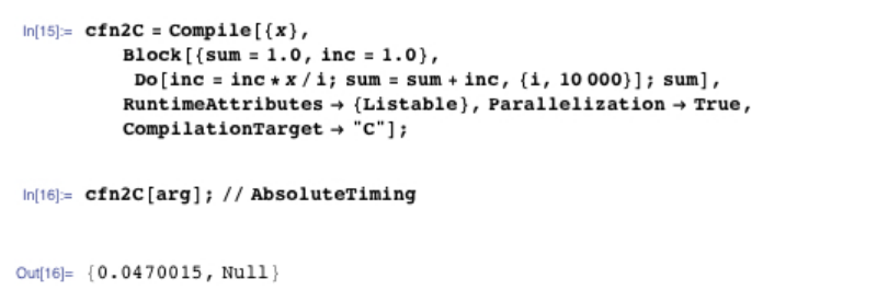 Compile函数接受Mathematica的代码,并让你预先声明输入参数的类型(比如实数、复数等)和结构(如数值、列表、矩阵等)。这虽然失去了Mathematica语言灵活性的优势,但是可以免于担心类似于“如果参数是符号怎么办?”的问题,Mathematica也可以最优化程序并创建一个字节码在虚拟器上运行。并不是所有东西都可以被编译,且简单的代码可能不会有太大效果,但是那种复杂的低阶数字代码速度可以得到大大的提升。