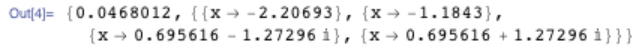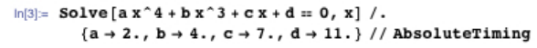 在符号运算中也是这样。如果你不是很在意符号式的结果,并且计算的稳定性也不是问题的话,那么尽快使用数值作为替代。比如,求解下面的二项式符号计算时,在使用数值作为替代之前,这个代码可能会让Mathematica生成长达五页的中间符号表达式。