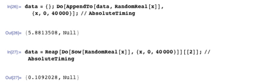因为Mathematica数据结构的灵活性,AppendTo不会假设你要追加的是一个数字,因为你要追加的可能是一个文件、音频或者图像等。所以AppendTo必须为所有数据创建一个新的副本,并重新调整架构以适应新追加的信息。当数据累积的时候这个过程会变得越来越慢。(而且构建data=Append[data,value]与AppendTo一样。)