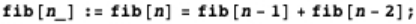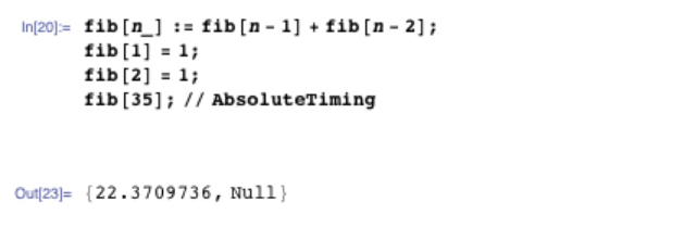 看下这个例子,一个很可怕的执行斐波那契数的方法。如果你没有考虑到数列的双重递归,你可能会惊讶计算fib[35]怎么会需要22秒钟(大约和内置函数计算Fibonacci[1000000000]所有208,987,639位数字需要的时间一样)(请看诀窍3)。