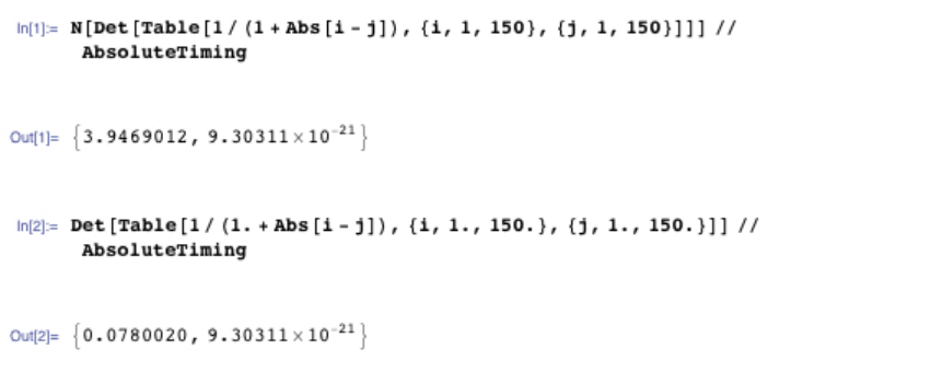 在多数与数字相关的软件中,是不需要这么精确的代数的。1/3和0.33333333333333是一样的。当你碰到特别严重的在数字上不稳定的问题时这个差异可能会被放大的特别明显,但是,在大多数情况中,浮点数已经足够使用了,而且最重要的是,浮点数运算更快。Mathematica中,任何小于16位的小数都被看作是机器浮点数,所以如果更想要速度而可以舍弃一些精确性的时候,记得用小数(比如,三分之一输入为1./3.)。以下是一个例子,可以看到使用浮点数是精确数运行速度的50.6倍。在这个例子中,两个数字的使用得到的是同一个结果。