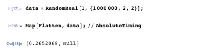 下面举一个这样的例子。如果我有一个一百万2x2矩阵的列表,我想把该列表转换成一百万个包含四个元素的列表,概念上来说最简单的方法是用Map把已经用Flatten扁平化过的数据进行映射即可。