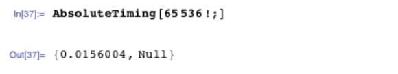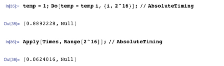 为什么?你可能会猜可能Do的循环很慢,或者所有这些任务缓存都需要时间,或者可能第一次执行的时候有什么东西出了问题,但是实际的原因很难预料到。Time有一个很聪明的二元分离的小技巧,可以在当你有大量整数参数的情况下使用,即将循环将参数分成两个更小的乘积(1*2*…*32767)*(32768*…*65536),而不是把这个参数从第一个用到最后一个。当然要做的乘法数量还是一样,但是不会再包括数值非常大的整数,所以平均来说,运算的速度会更快。在Mathematica中有很多这样隐藏的小魔法,而且每次新版本发布都会有更多的小技巧加入。