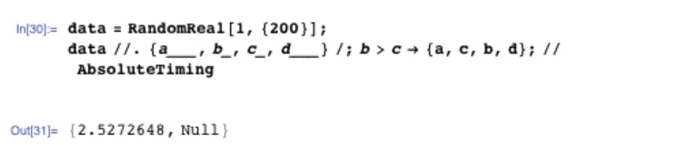模式匹配很好,可以让项目中复杂的任务变得简单一点。但是它有时会很慢,尤其是像BlankNullSequence这种比较复杂的模式(通常写作“___”)中,可能会花很长时间仔细在你的数据中搜索一些——你作为一个程序员可能已经可以判断的——不存在的模式。如果想要速度的话,那么选择范围更窄的模式,或者不用模式会更好。