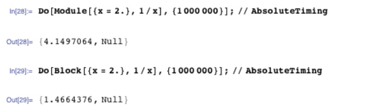 Block,With和Module都是本地化构建的工具,但是属性上有些小区别。根据我的经验,95%以上的几率在我写的代码中Block和Module是可以互相替换的,但是Block通常快一点,而在另一些例子中(Block的变量在只读状态的情况下)With会快一些。