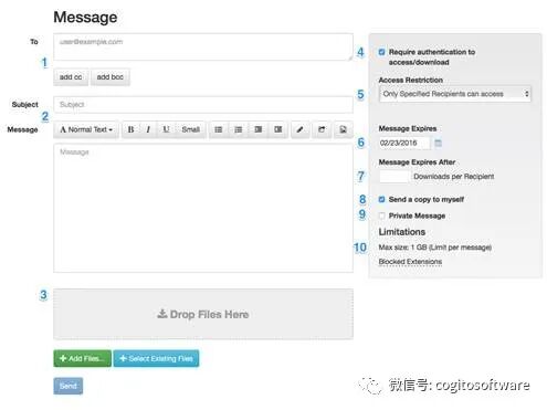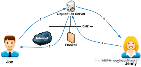 在这个例子中,市场营销部的Jenny给Joe发了一份营销简报,Joe是一家广告公司的合伙人,她正在为一个新的活动做准备。由于她需要发送的文件很大,大约100 MB(100 MB在对于电子邮件来说是很大的,LiquidFiles可以发送不受限制的文件大小,因此100 MB对于LiquidFiles来说不是很大),而且有些敏感,实际上电子邮件发不出去。幸运的是,她使用的是公司安装的LiquidFiles文件传输设备。