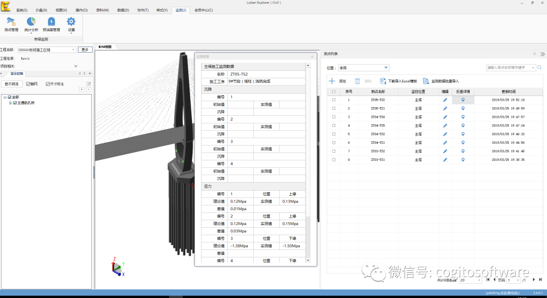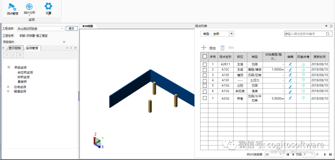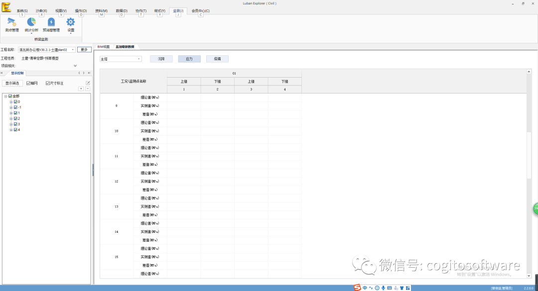 在监测管理的树节点支持同一监测项目创建多份实例,满足包含多个相同单位工程的工程模型,分节点录入监测数据,分节点管理监测数据,分节点存储监测数据,体现工程的监测类,可复制性的特点,直观清晰的浏览各个单位工程的监测数据,为施工后期用户梳理监测资料,节省大量时间。