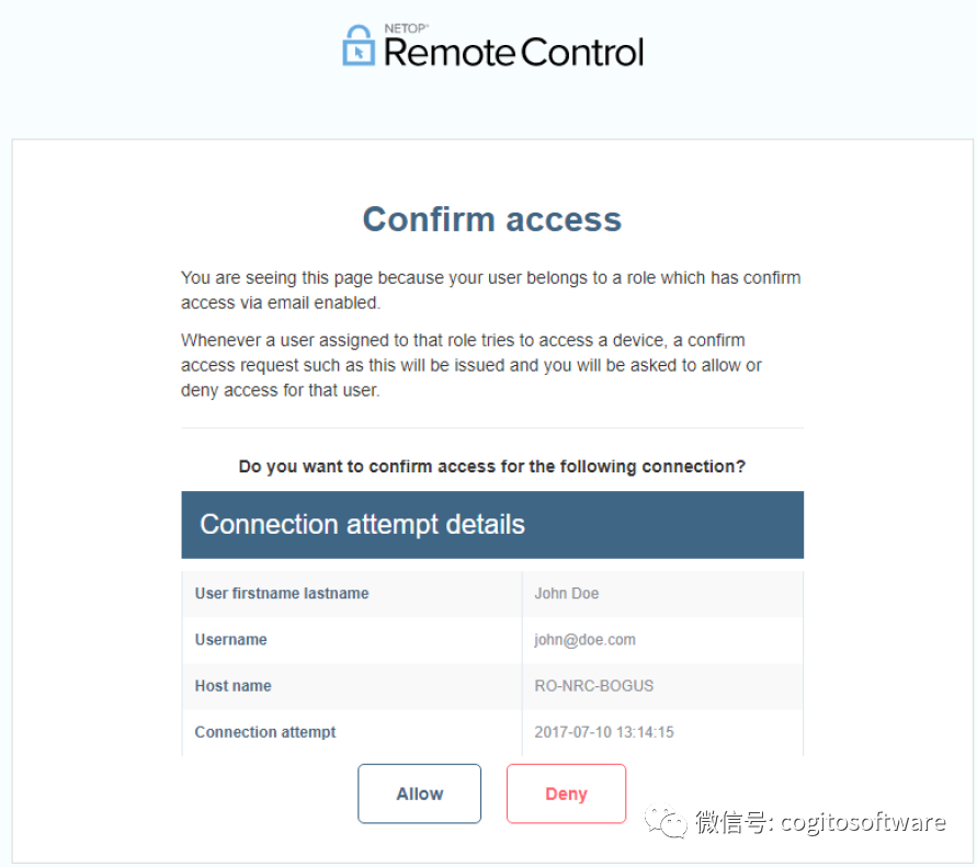 通过单击电子邮件中的“确认访问”链接,用户将被重定向到Netop Portal,他们可以在其中允许或拒绝对设备的访问。