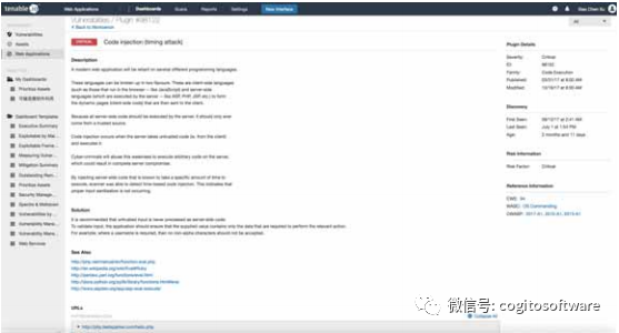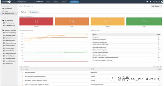 Tenable.io Web App Scanning 的仪表盘清晰展示了所有扫描的Web应用程序。开发者可基于时间和风险级别查看风险,还可以查看OWASP十大安全问题,为开发人员提供所有漏洞的详细修补说明。
