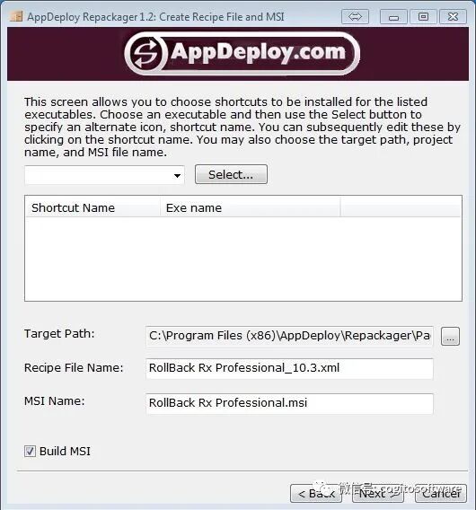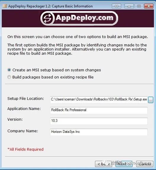 2.打开AppDeploy并选择“根据系统更改创建MSI设置”。 在安装文件位置,从根文件夹中选择“ Setup.exe”,其余的将自动填写。