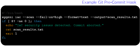 在Git中添加 Xygeni 扫描,将其用作提交前的钩子,在代码提交前自动检查基础设施配置缺陷。确保潜在问题在开发初期阶段即被解决。