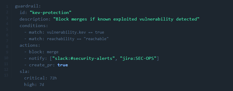 本规则强制禁止合并存在已知利用漏洞的代码,通知相关渠道,并在CI/CD防护栏内自动创建修复PR。