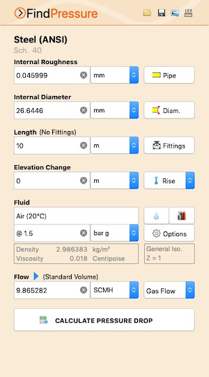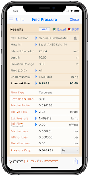 查看 Pipe Flow Wizard Software for iOS的压降计算与结果截图。
