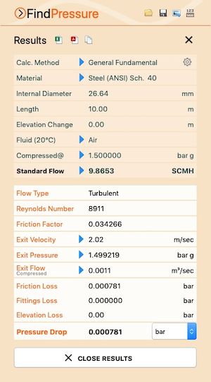 查看Pipe Flow Wizard Software for macOS的压降计算与结果截图。
