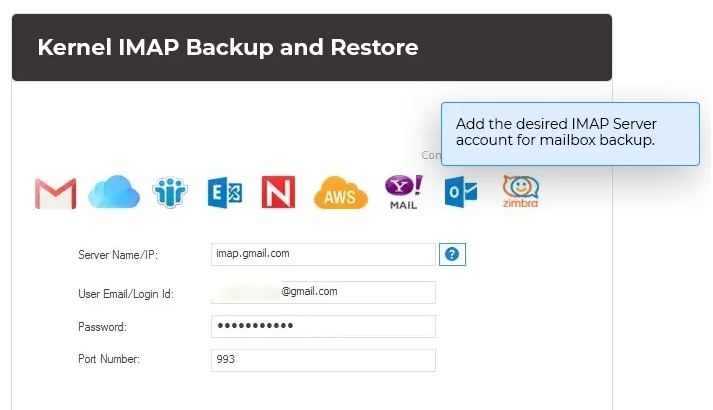 IMAP备份工具提供您所需的所有信息,包括所有IMAP服务器帐户的服务器名称、身份验证信息和端口号详细信息。您只需提供登录凭据即可添加IMAP帐户。