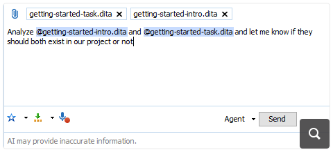 聊天视图提供三种模式:代理模式、DITA代理模式和提问模式,均自动采用当前项目、文档及(DITA模式下)地图上下文。新增工具如search_in_project、grep_project、list_dir和edit_document,配合直接在聊天中使用的XML重构工具,使AI能够探索项目、搜索内容、重构结构并执行精准编辑,作为代理工作流的组成部分。