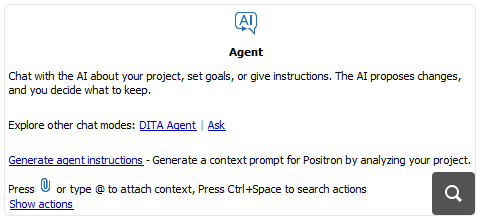 您现在可通过“生成代理指令”操作(位于欢迎面板或智能代理操作中)创建项目上下文提示。该提示能帮助AI理解文档项目的结构与规范,确保生成的内容符合项目特定的组织架构、框架及元数据要求。生成的提示将作为Markdown文件保存至项目中,并在您使用聊天或其他AI操作时被AI Positron调用。