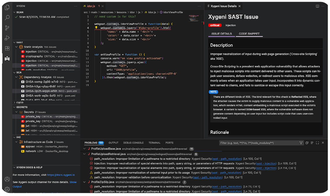 Xygeni SAST通过深度静态分析发现并修复关键漏洞,确保代码满足最高可靠性与合规性标准。