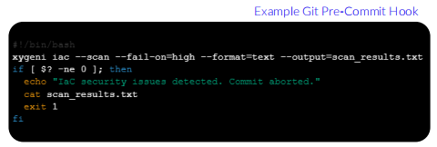 在Git中添加 Xygeni 扫描,将其用作提交前的钩子,在代码提交前自动检查基础设施配置缺陷。确保潜在问题在开发初期阶段即被解决。