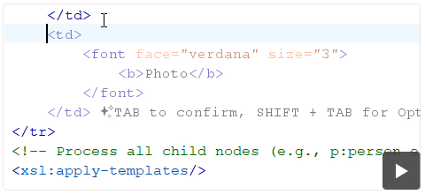 全新AI自动补全功能可在光标位置实时提供感知上下文的代码与标记建议(如XSLT、XSD、JSON Schema或Schematron),并可通过自动补全操作调用。“生成代码”操作现可在提示中包含关联XML或实例的结构以优化结果,并支持通过编辑器快捷键Ctrl+G/Command+G触发。AI开发操作(生成代码、解释代码、代码讨论)新增对更多文档类型的支持(包括HTML、XHTML、XProc、XSpec),便于在更广泛的文档范围内生成、审查和讨论代码。