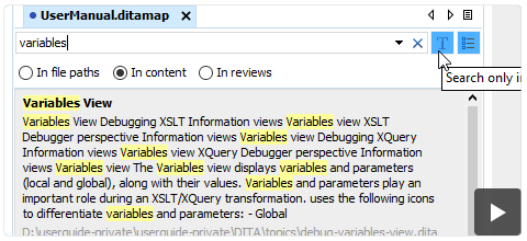 通过DITA地图管理器视图顶部的新搜索框和筛选选项,您可快速检索并筛选地图中引用的主题。新增的筛选切换功能支持仅搜索标题或以平面列表形式显示结果,助您高效定位所需资源。
