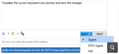 聊天视图提供三种模式:代理模式、DITA代理模式和提问模式,均自动采用当前项目、文档及(DITA模式下)地图上下文。新增工具如search_in_project、grep_project、list_dir和edit_document,配合直接在聊天中使用的XML重构工具,使AI能够探索项目、搜索内容、重构结构并执行精准编辑,作为代理工作流的组成部分。