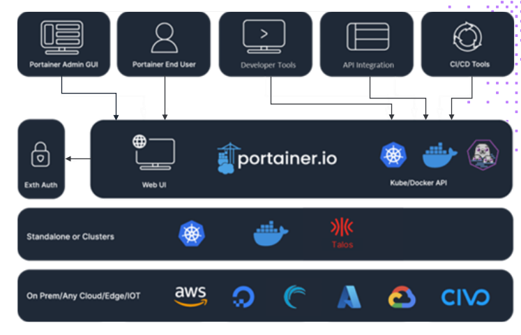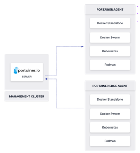 Portainer 自身以容器化方式部署,通常运行在专用的管理节点或集群上。其架构极为轻量(仅需 1 核 CPU,2GB 内存),因此专用管理节点的资源开销几乎可以忽略不计。