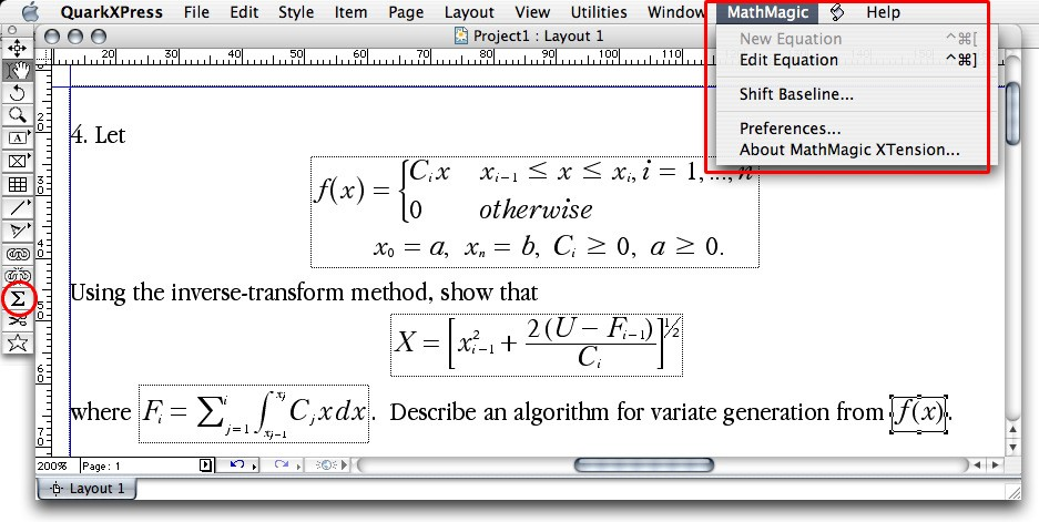 •您可以从QuarkXPress的浮动主工具栏中选择Sigma工具按钮以创建方程框,然后在文档中拖动矩形以指定由外部MathMagic Pro应用程序创建的方程式的位置。