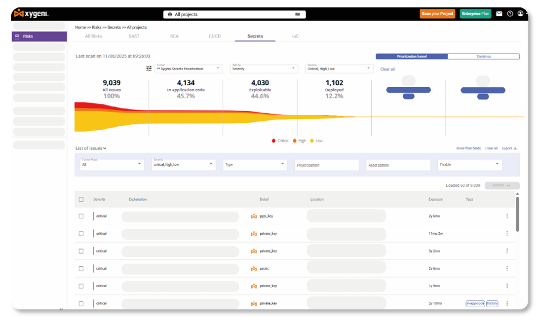 Xygeni 机密安全将原始检测转化为清晰可行的情报。它使安全与工程团队能够全面掌握密钥暴露位置、关键程度及实际可利用性。