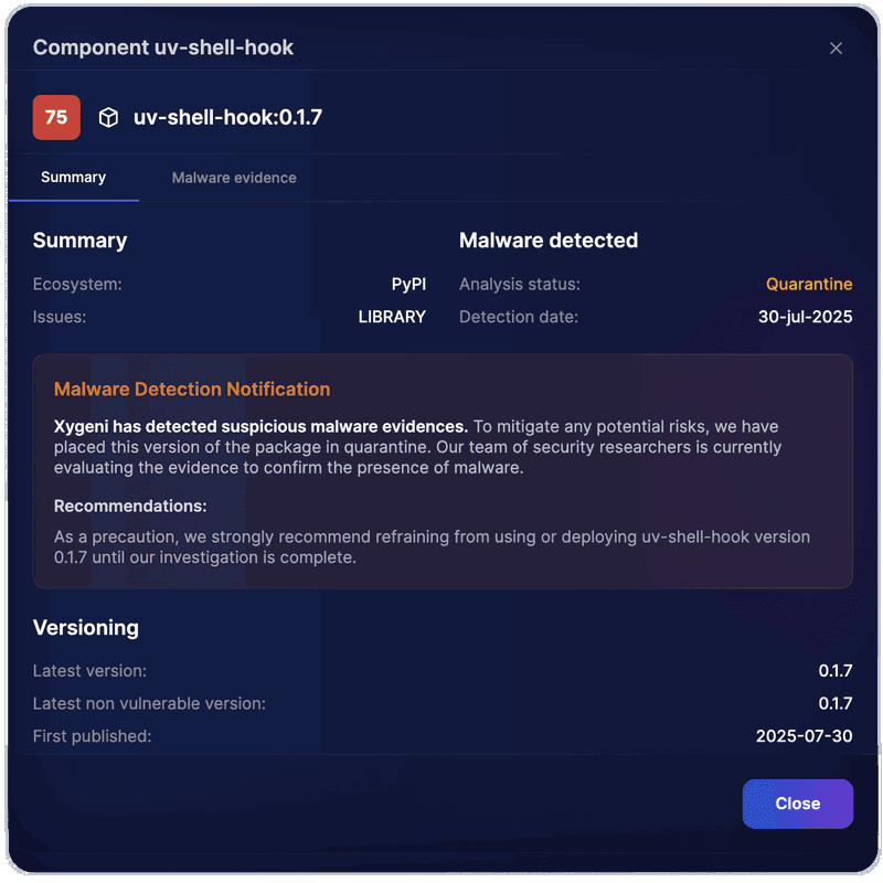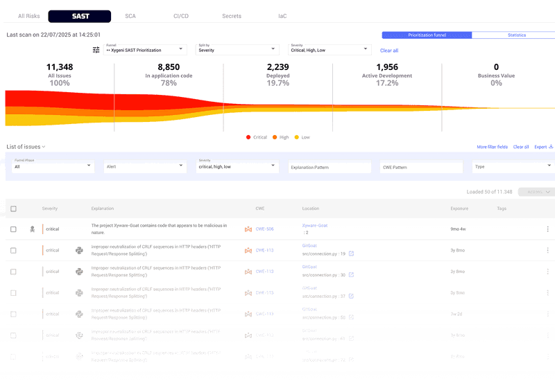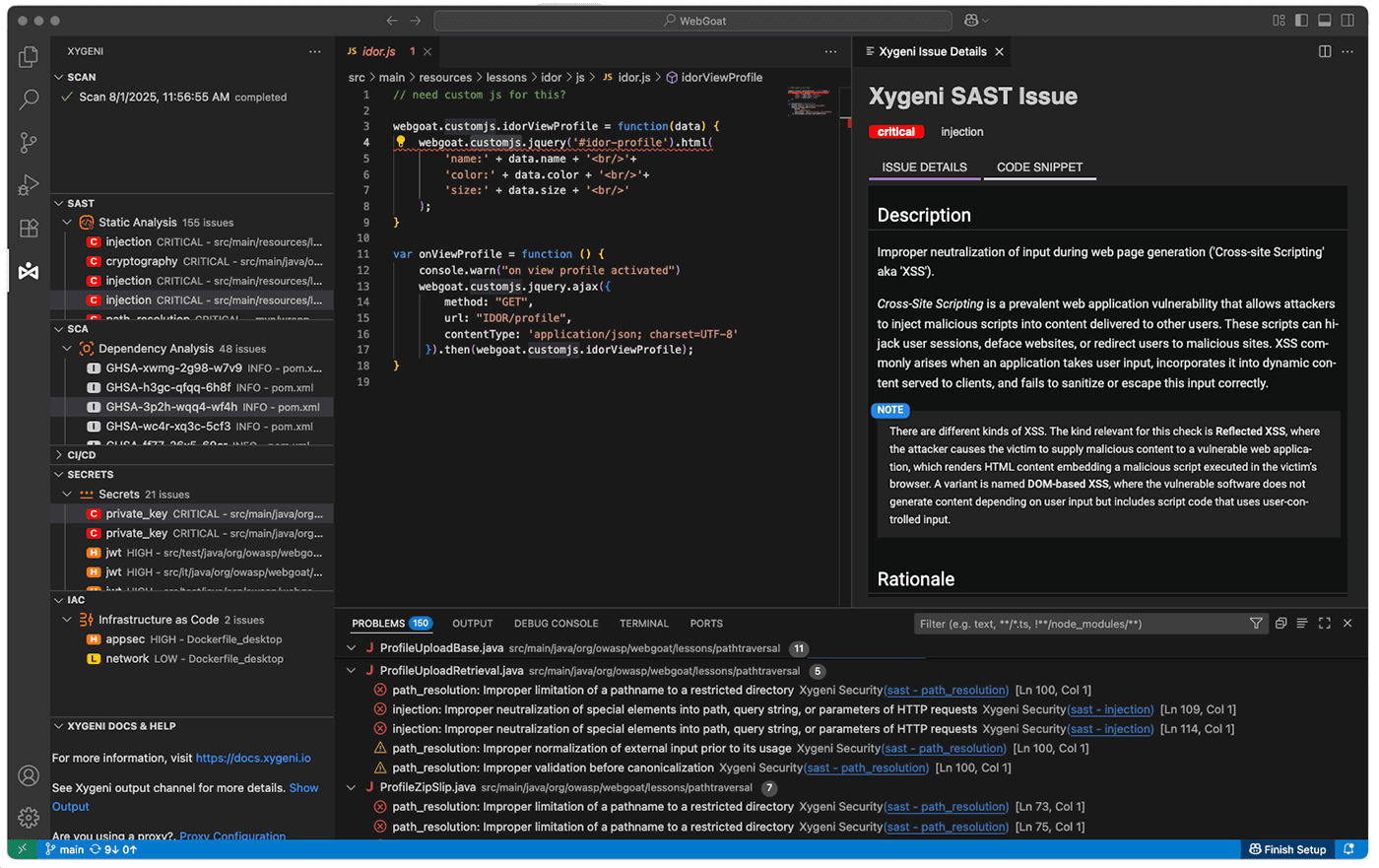 Xygeni 深度扫描自定义代码中的恶意软件特征、混淆逻辑及可疑模式。依据 CWE-506 等标准标记隐蔽威胁,阻止其进入生产环境。