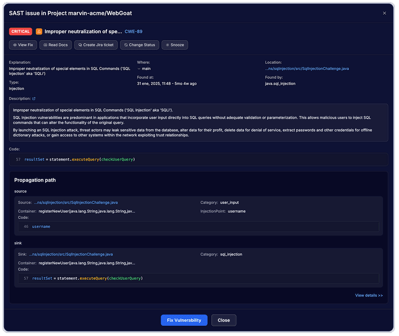 编码即防护。直接在集成开发环境扫描,无需离开编辑器即可查看漏洞、审查元数据并应用修复方案。