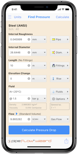 查看 Pipe Flow Wizard Software for iOS的压降计算与结果截图。