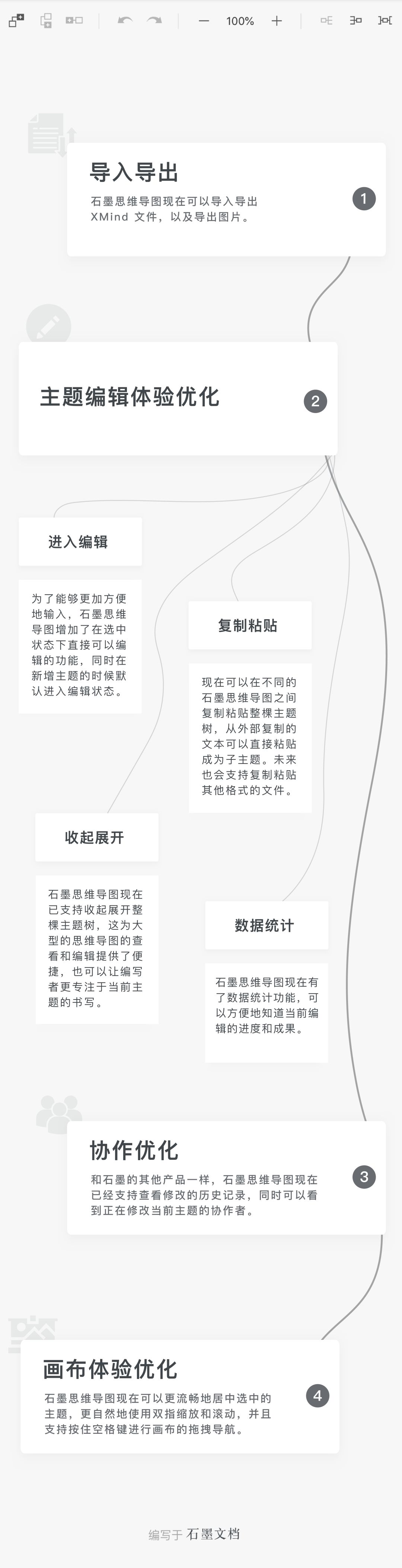 经过 3 个月的开发,我们对石墨思维导图进行了全面的优化,并且增加了实用新功能,比如导入导出 XMind 文件、导出为图片、新建主题默认进入编辑等等。升级后的思维导图能够帮助大家进一步提升思维导图的编辑效率和体验。