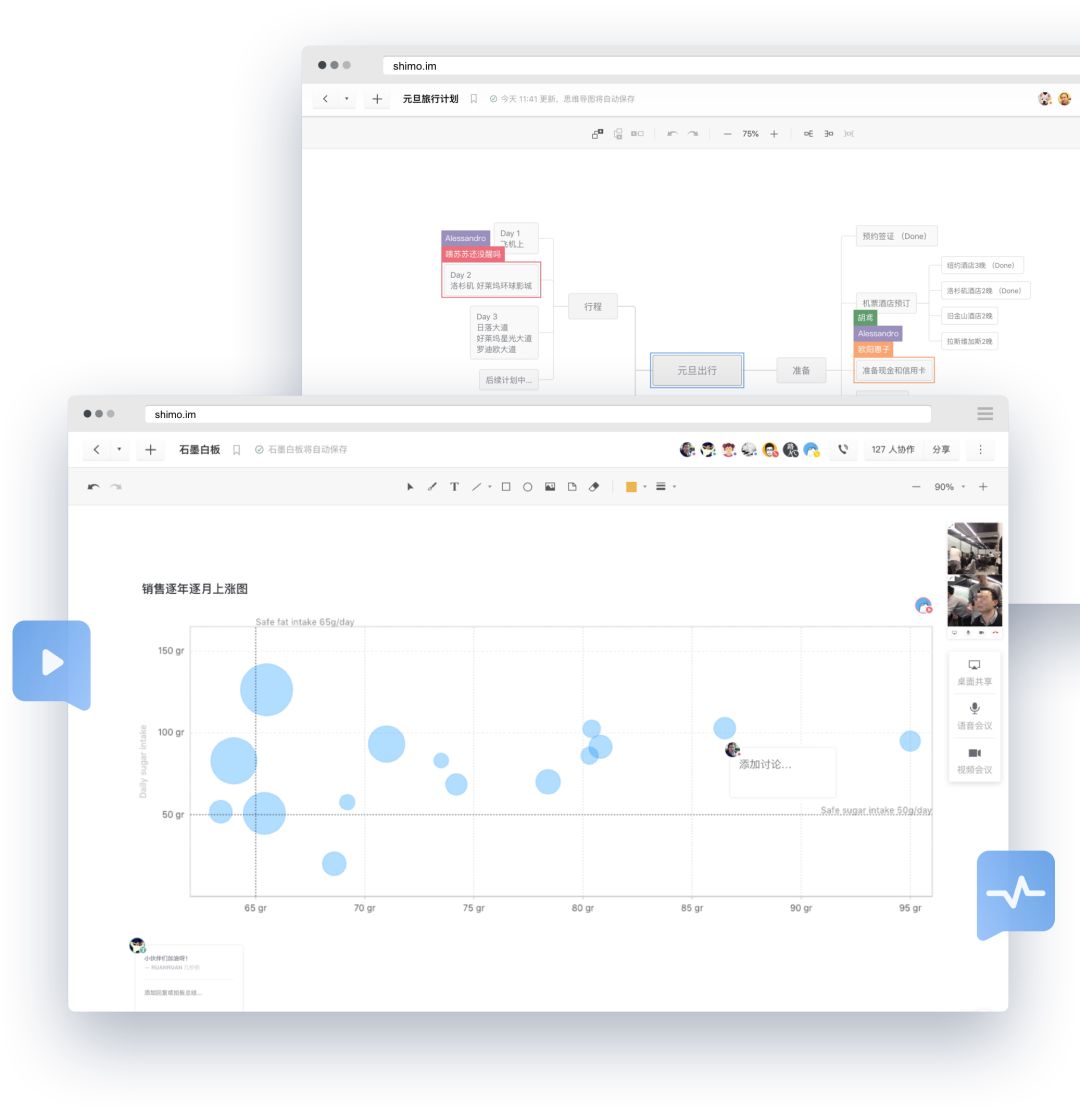 石墨白板让远程会议更加高效便捷,多位成员通过音视频连线,围绕一个话题各抒己见,边聊边写,边聊边画,讨论思路与结果同步呈现。
