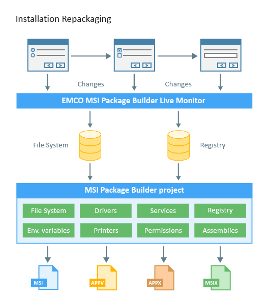 EMCO MSI Package Builder集成了用于重新打包的一流实时监控技术。它集成到Windows中以捕获重新打包安装所执行的文件系统、注册表和权限更改。在重新打包期间,您只需要手动遵循重新打包安装的安装步骤。选择安装选项后,受监视的安装程序将应用EMCO MSI Package Builder捕获的相应文件系统、注册表和权限更改。