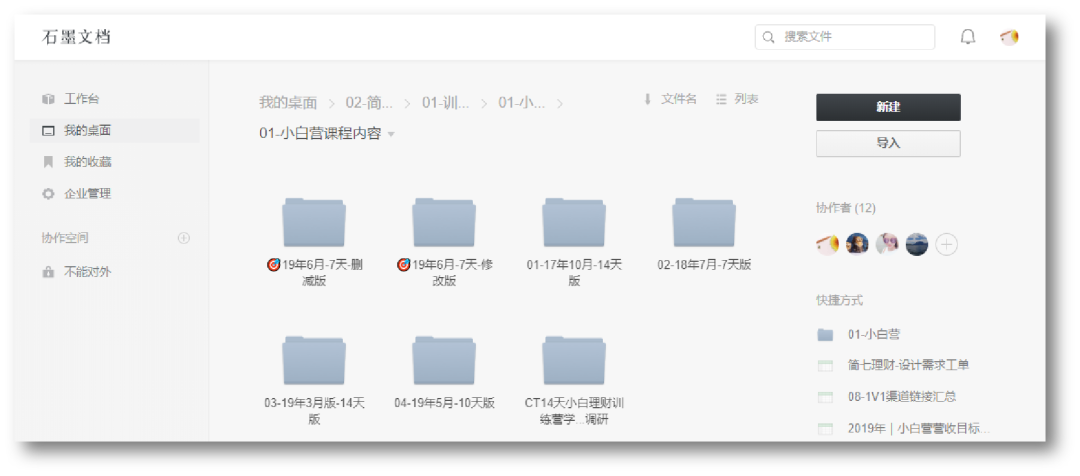 对于内容部来说,每一门课程都是一个独立的项目,他们将课程相关的所有内容规范存储于石墨文档对应的文件夹,这为项目管理,以及内容的随时查阅、使用提供了便利。