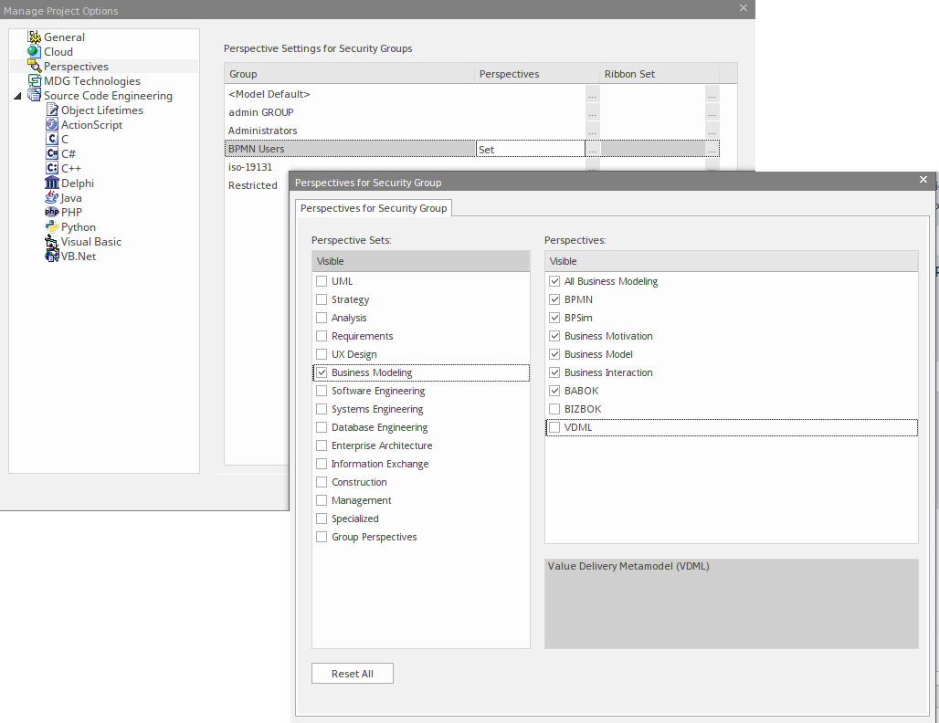 基于每个模型与安全组相关联的透视集允许管理员和企业所有者基于他们关注的领域和能力来定制特定建模人员的视图和范围。 例如,过去使用BPMN的业务建模者可能仅限于使用BPMN技术,当他们处于特定模型时,从其接口中删除所有不必要的透视图和技术集。 同样,可以隐藏特定的功能菜单以进一步定制和聚焦建模者工作空间