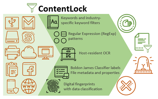 第三个功能组件 – ContentLock™也是DeviceLock Core的可选附件,对受保护计算机上使用或从受保护计算机上传输的文件和其他数据对象执行内容检查和筛选。对于本地访问和传输操作,由DeviceLock Core提供数据对象以对ContentLock进行分析,而NetworkLock提供文件、消息、IM会话、Web表单交互以及从网络通信中提取的其他数据到ContentLock。