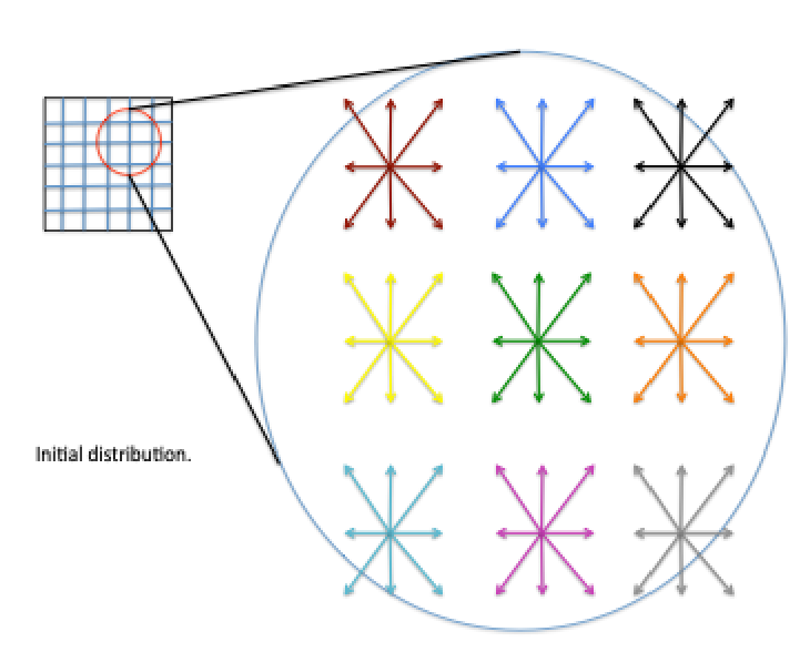 要将迁移步骤可视化,想象一下离散化的域。此域的每个网格点上有 9 个分布函数(如下图所示)。请注意每个网格点的各种颜色。每个箭头的长度指示相应的分布函数的大小: