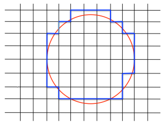 这种方法并不理想,因为它扭曲了原始物体。如要更好的表示物体,需要使用极其精细的网格,但这让计算成本昂贵并且造成不必要的浪费。另外,尖锐的边角会使流体产生不希望的行为。第二种方法是将物体浸入到网格中。物体的边界被离散化,并浸入至域中: