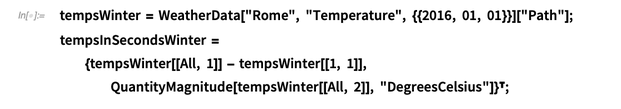 现在,我们将使用Wolfram | Alpha来获取罗马冬季的某一天的温度数据作为案例研究,并使用它来定义完整的房间+散热器模型所需的平均外部温度:
