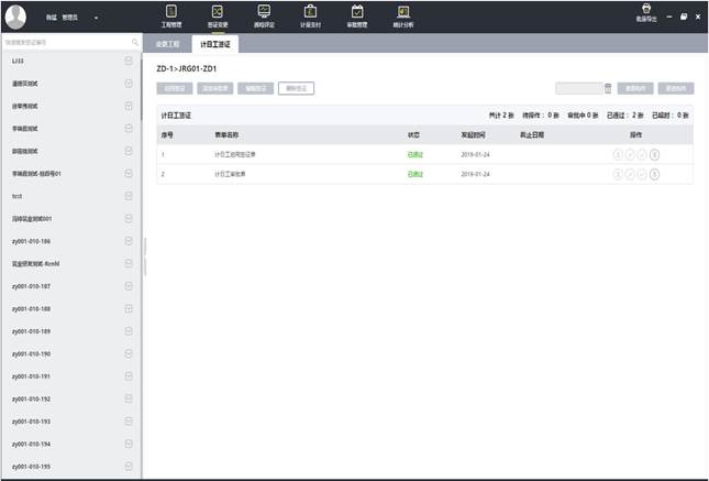 进行项目合同的整体管理,可对项目工程进行划分,划分后的工程与模型构件组关联,支持与BIM模型内的构件组相互反查;还可对每个项目的合同清单及每个划分后工程的清单进行管理,为质检资料建立基础数据支撑;