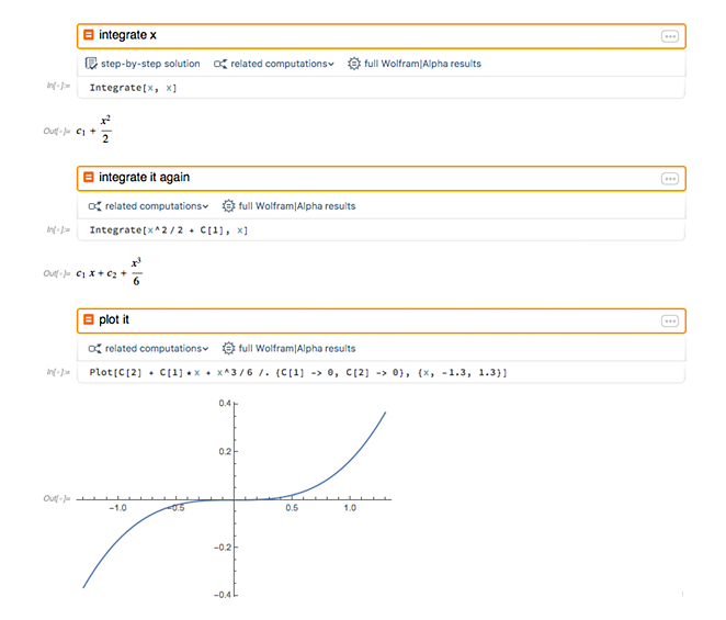 处理多步计算时往往会遇到很多复杂的设计和实现问题。例如,如果您有一个传统的不定积分的解,其表示式会有积分常数,那么在绘制结果时,如何处理该常数?(Wolfram|Alpha Notebook Edition将积分常数均设置为零,保证了图形的一致性。)