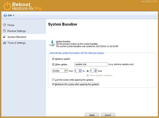 在Reboot Restore Rx Professional内,用户可以在系统基线菜单中设置程序自动下载、运行和安装Windows更新和其他更新。