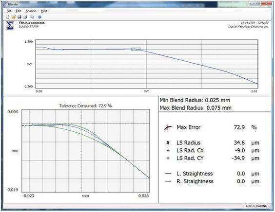 共混半径分析基于用户选择的角区域(避免了零公差条件)。在理想的情况下(锐角),最大内误差报告为可用公差的百分比(上文)。最大向内误差和最大向外误差用红线表示在图上。