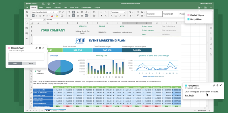 与您的团队协作处理业务报告和库存记录。访问、分享电子表格,甚至链接至特定的范围;实时共同编辑;在单元格上留下评论;与协作者在线聊天。进行这些操作时您完全无需离开编辑器。让其他用户在编辑电子表格时应用自己的过滤条件,而又不会打扰协作作者。