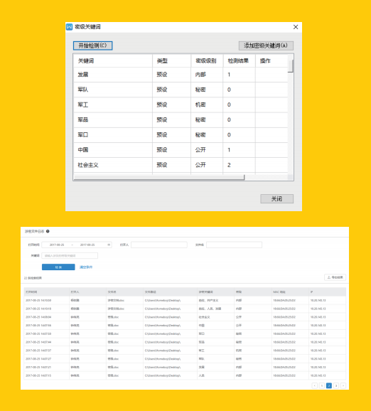 打开文档自动扫描密级关键字,若发现异常情况自动上报通知管理。将涉密文件扫描转变成日常工作,随时发现,随时处理,降低保密检查风险。