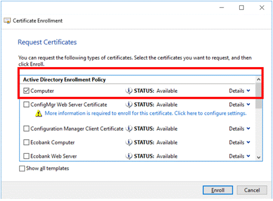 选择一个注册策略和所需的证书类型。 在本例中,我们选择了由域管理员配置的策略,以实现此类目的。 您可以与域管理员联系,以定义环境中的最佳选项。