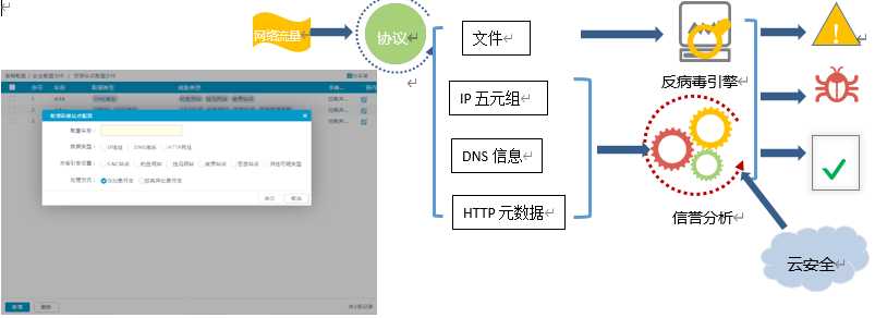 恶意站点信誉分析功能可实时对IP、DNS、HTTP协议产生的元数据进行基于黑名单、模式匹配、机器学习、异常分析等技术进行信誉分析,可发现恶意代码产生的控制、传播、攻击流量,并进行阻断。